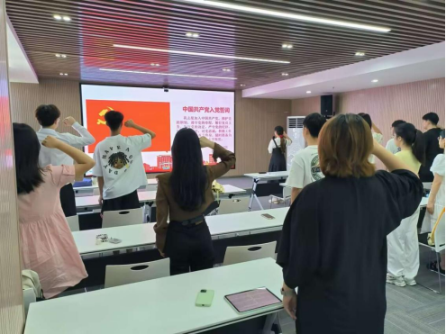 在冯欣怡同志的带领下全体党员重温入党誓词,许靖轩同志领学党章总纲部分第十章。随后,支部书记涂雅同志向大家介绍了党的二十届三中全会的主要议程及会议内容,对进一步全面深化改革的重大意义以及目标进行了阐述,并围绕“教育、科技、人才是中国式现代化的基础性、战略性支撑”这一重要论述分享了学习体会。